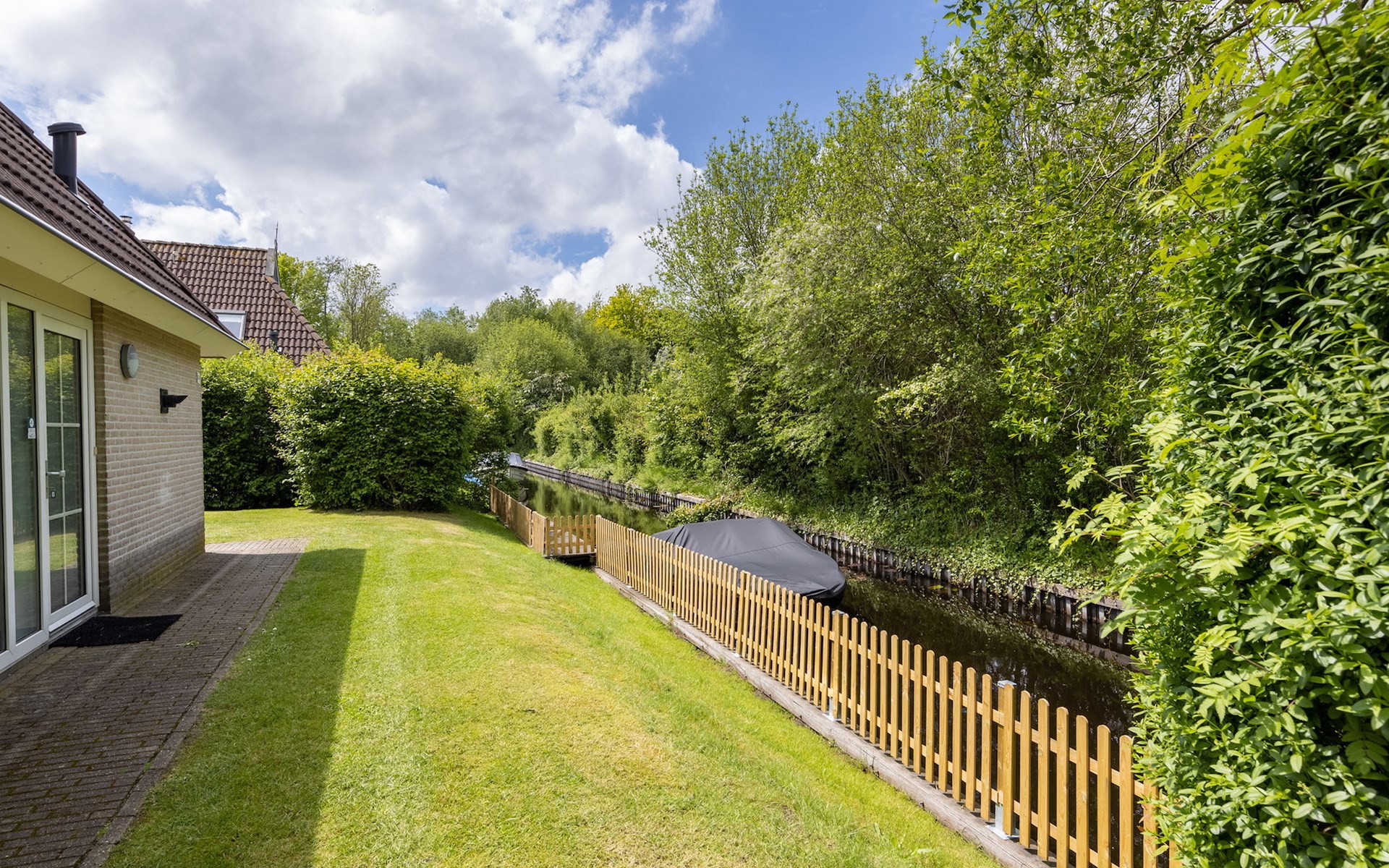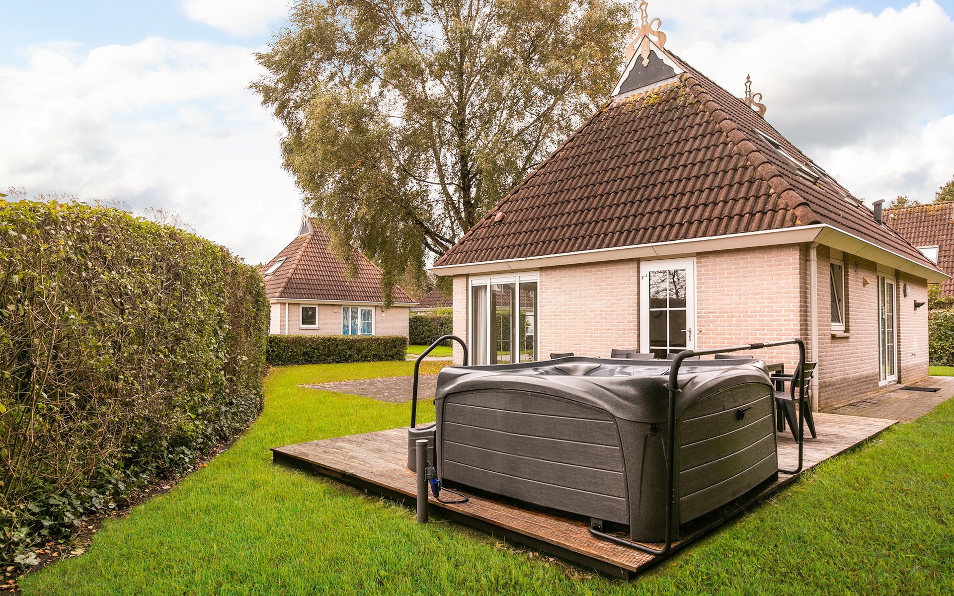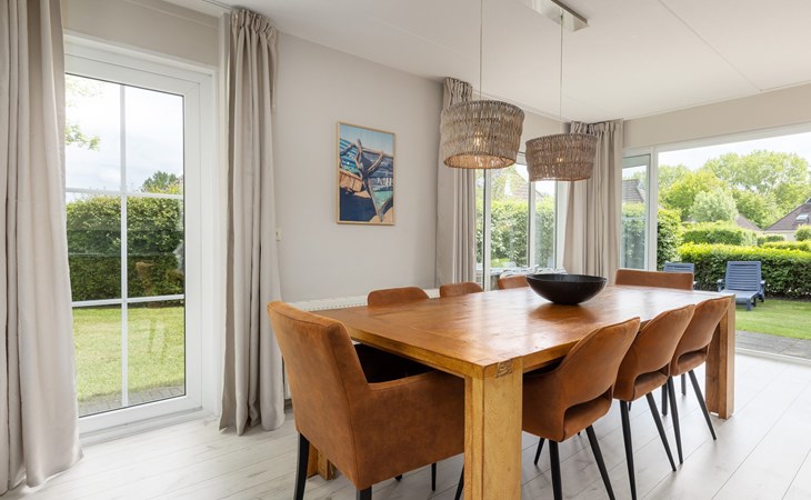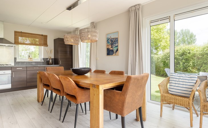 De bungalow heeft een gemeubileerd terras met parasol en een buitenspa. Daarnaast heeft de bungalow een privé aanlegsteiger.