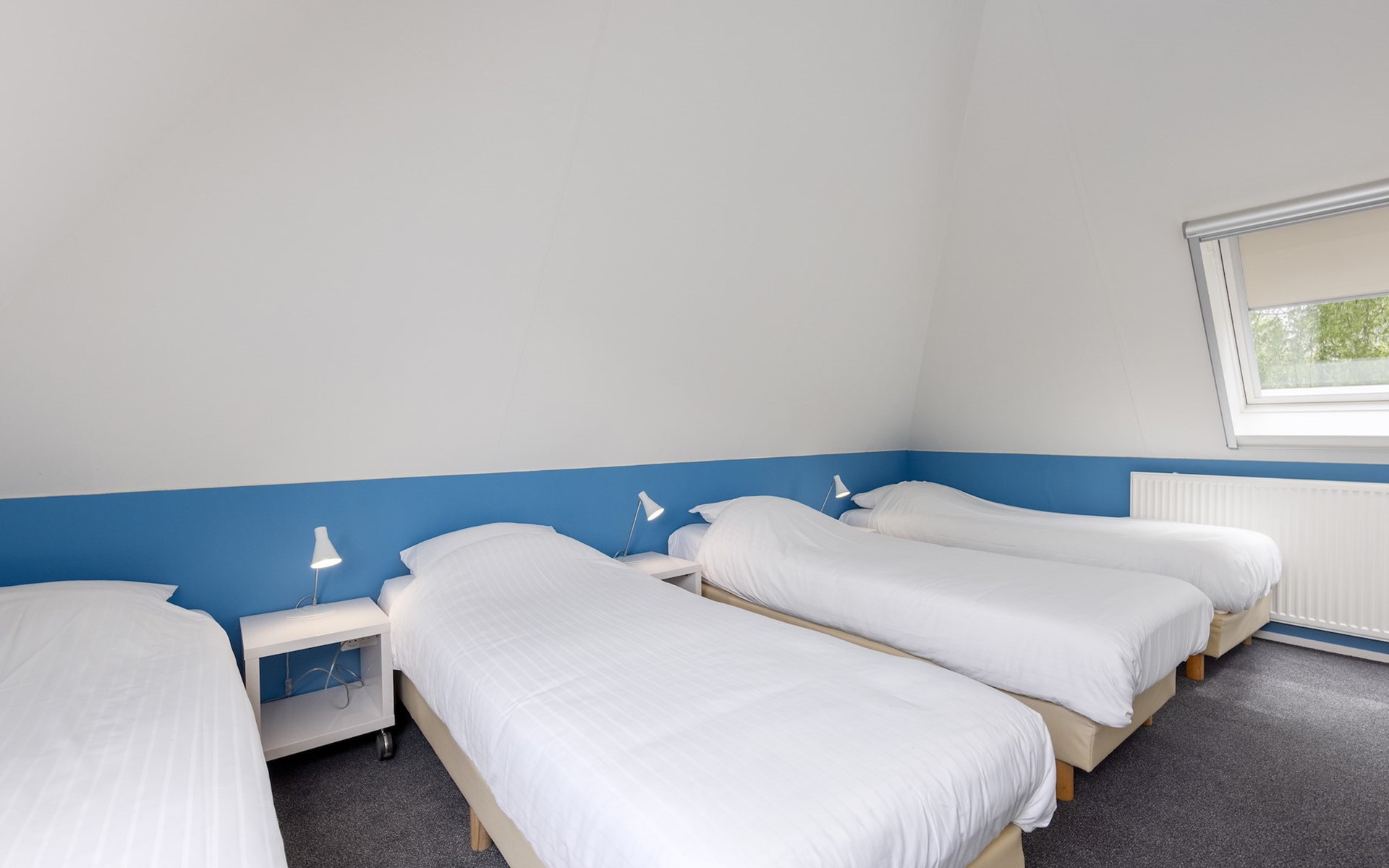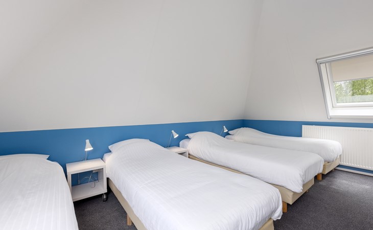 Op de eerste verdieping bevinden zich 2 slaapkamers en 1 badkamer. In beide slaapkamers staan 4 éénpersoons boxsprings. De badkamer beschikt over een douche, wastafel en een toilet.