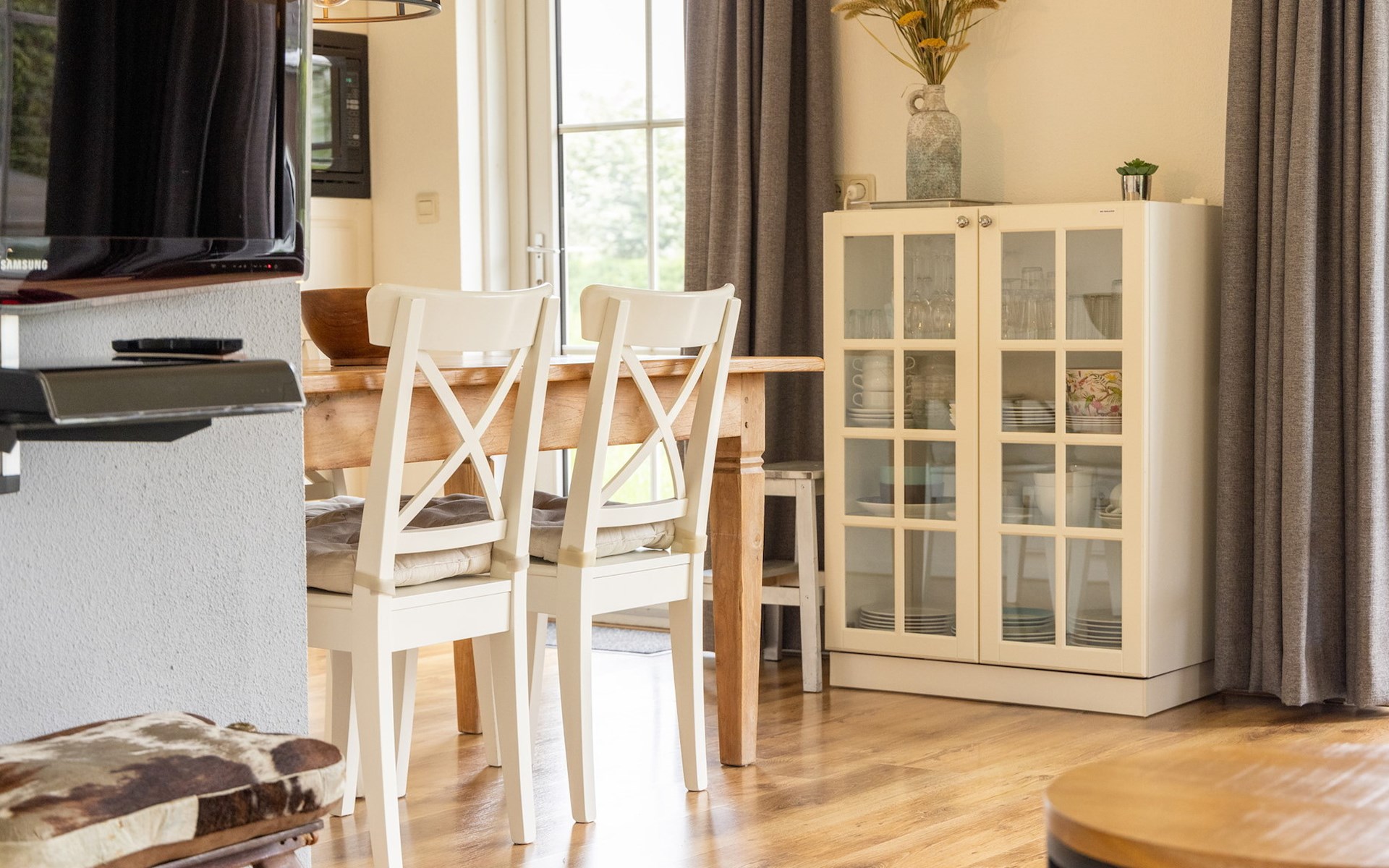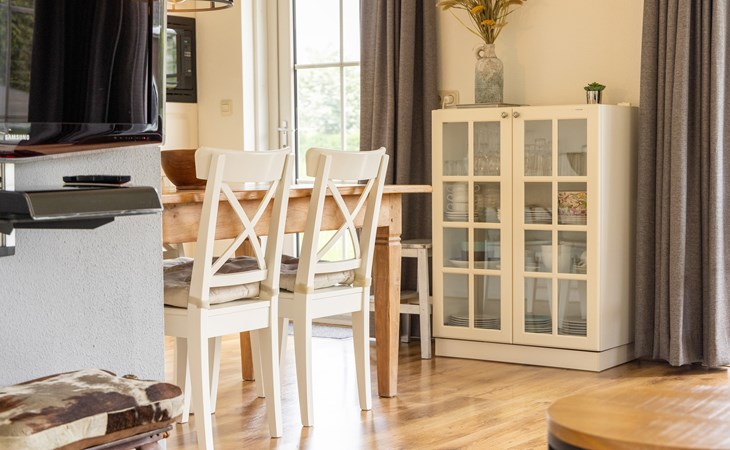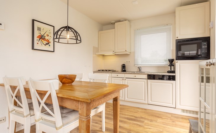 De woonkamer is ingericht met een zithoek en een televisie en grenst aan de open keuken met de eethoek. De keuken is voorzien van onder andere een koelkast met vriesvak, filterkoffiezetapparaat, combimagnetron en een vaatwasser. In de woonkamer is een 2-persoons bedstee aanwezig.