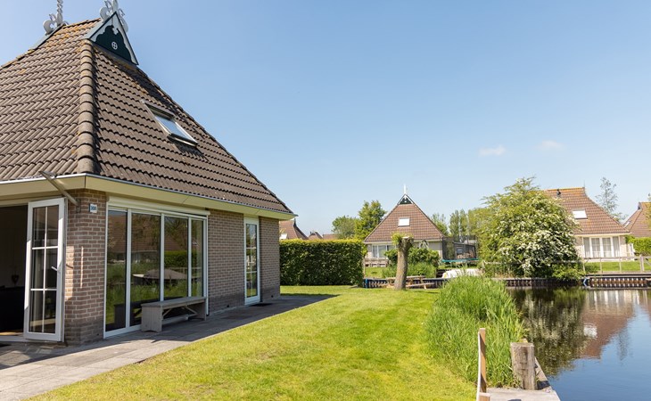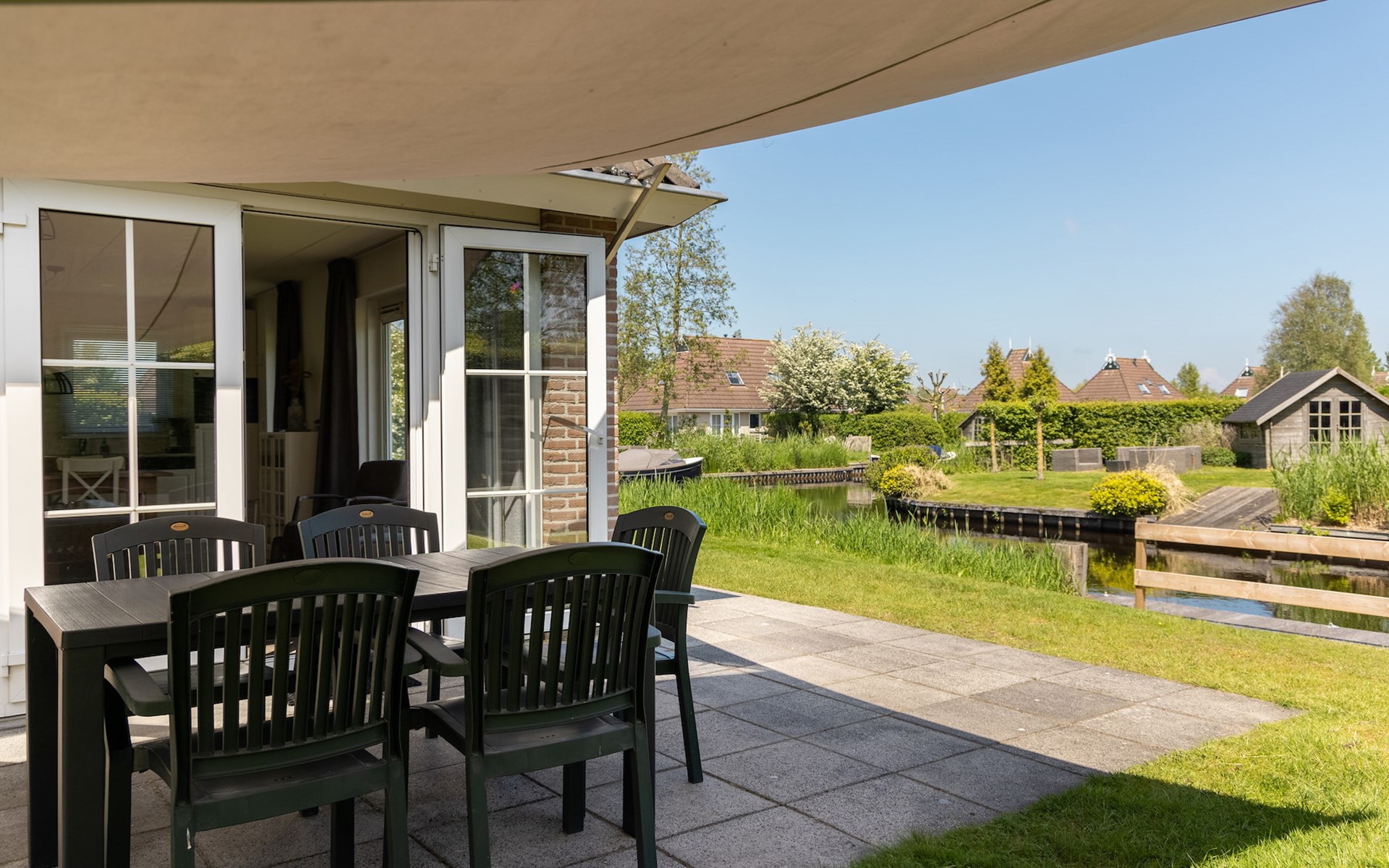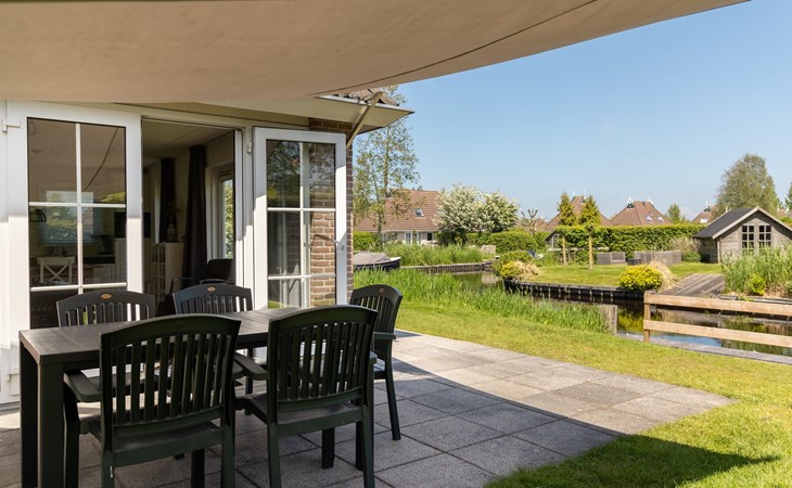 De bungalow heeft een gemeubileerd terras met een parasol. Daarnaast is er een privé aanlegsteiger.