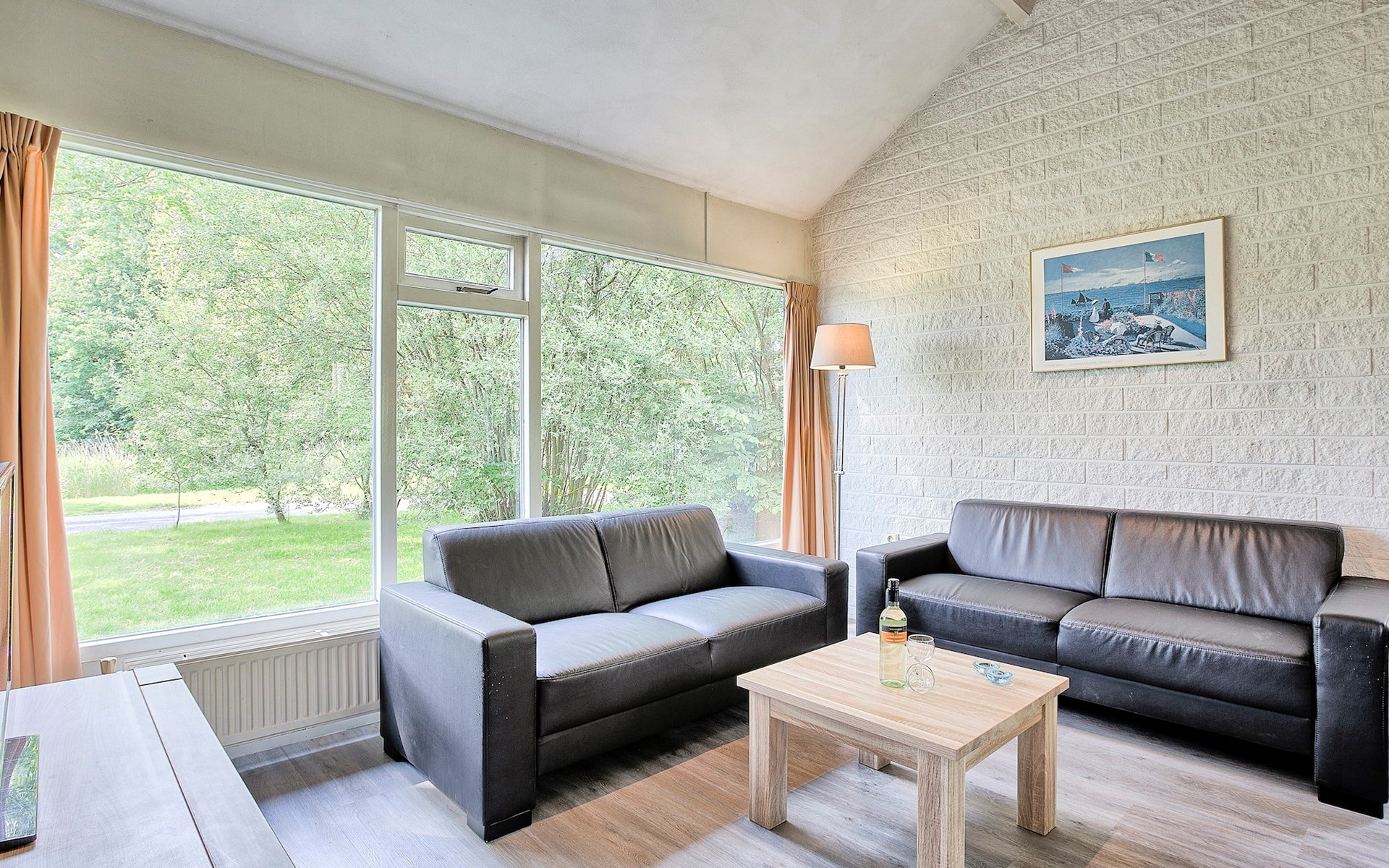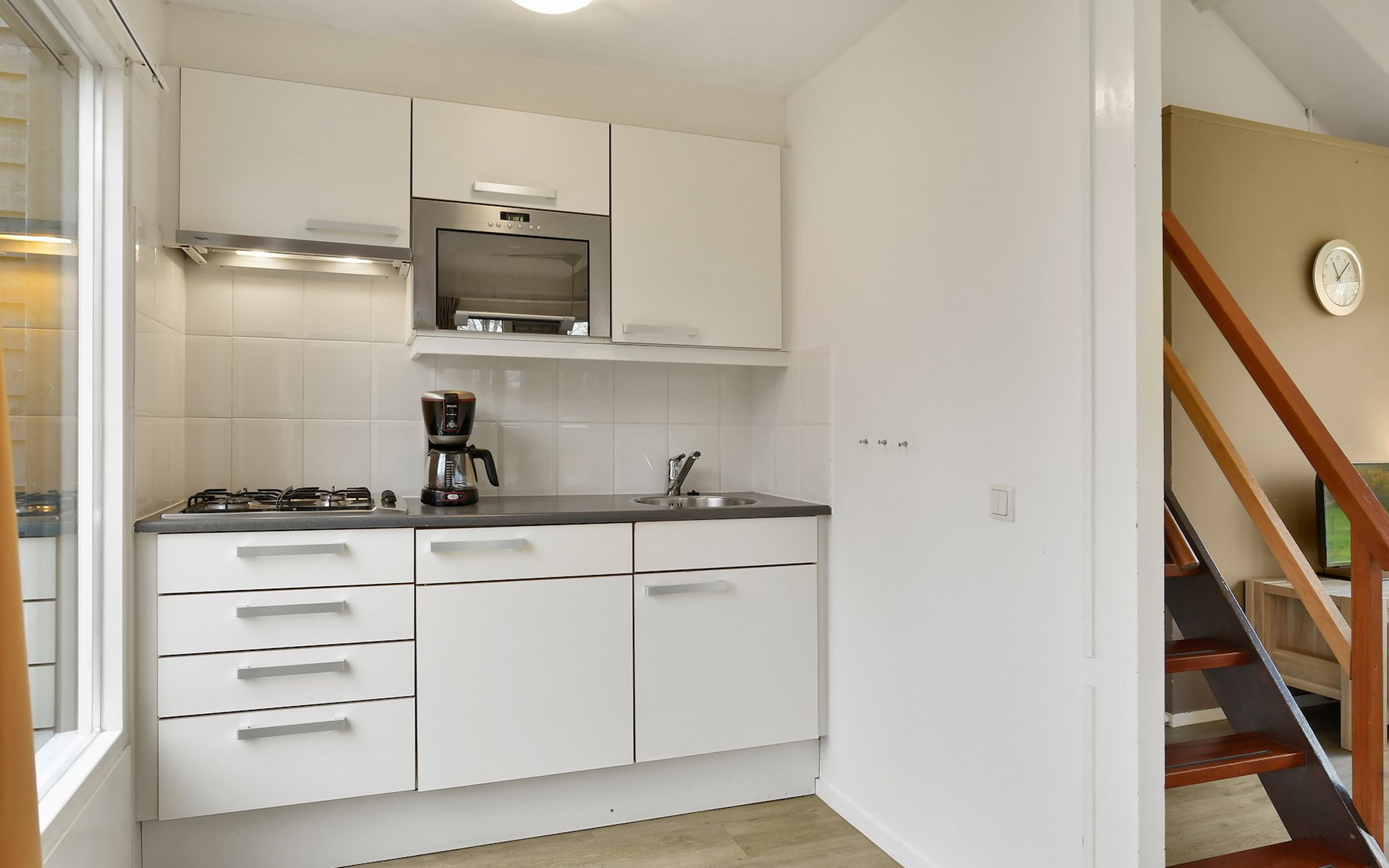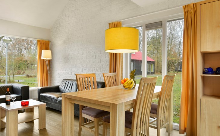 De woonkamer is ingericht met een zithoek, televisie, cd- en dvd-speler en een radio en grenst aan de open keuken met eethoek. Deze keuken is voorzien van onder andere een koelkast met vriesvak, filterkoffiezetapparaat en magnetron.