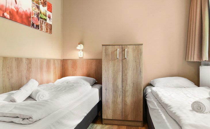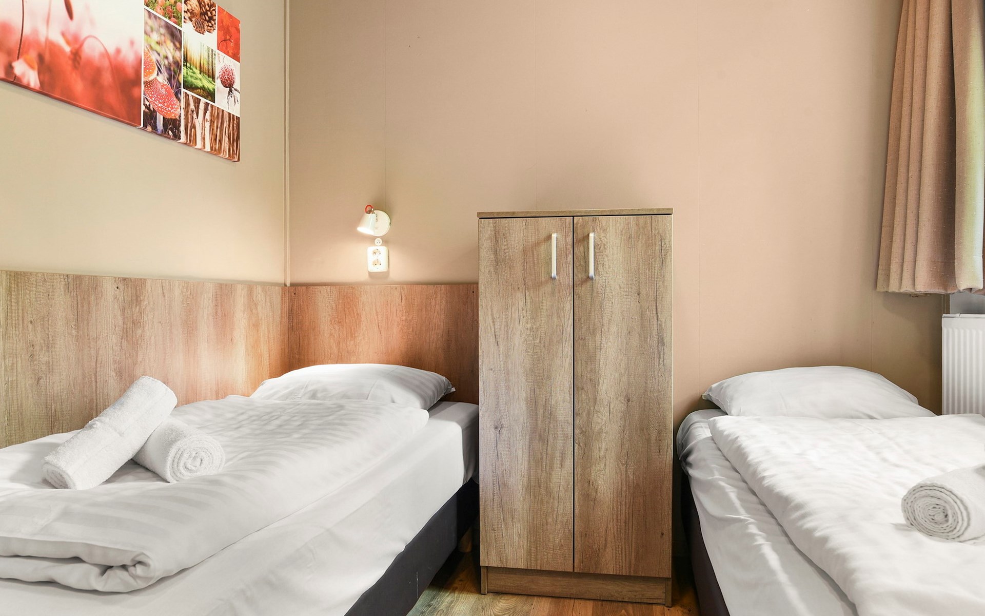 De bungalow heeft 4 slaapkamers waarvan 2 met 2 éénpersoons boxsprings met een eigen wastafel, één van deze slaapkamers heeft een 2-persoonssofttopper. In de 2 andere slaapkamers staan 2 éénpersoons boxsprings. De badkamer beschikt over een ligbad en/of douche en een wastafel. Er is een apart toilet aanwezig.