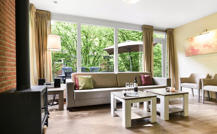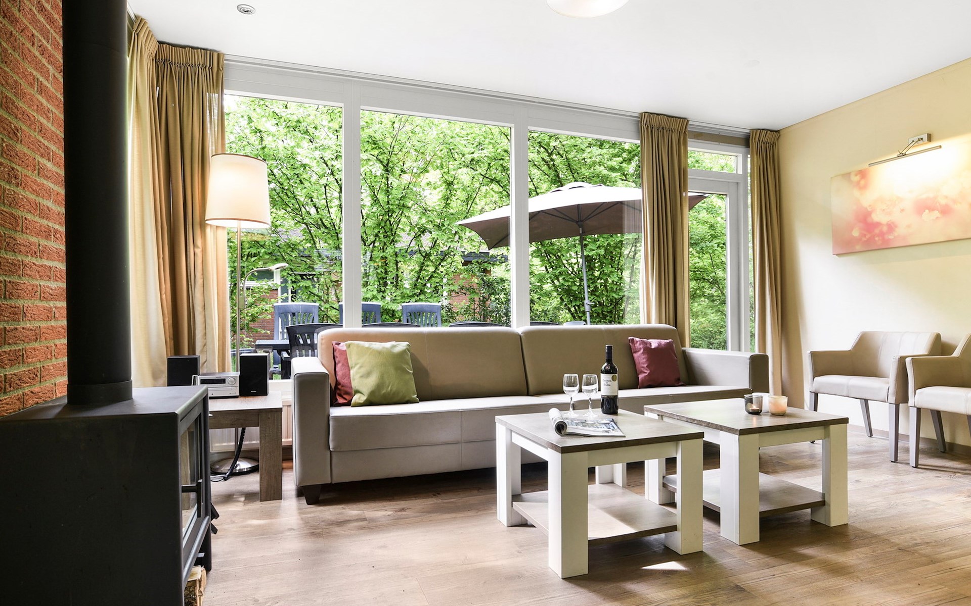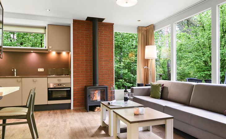 De woonkamer is ingericht met een zithoek, open haard en een televisie en grenst aan de open keuken met eethoek. De keuken is voorzien van onder andere een koelkast met vriesvak, combimagnetron, filterkoffiezetapparaat, Senseo apparaat en een vaatwasser.