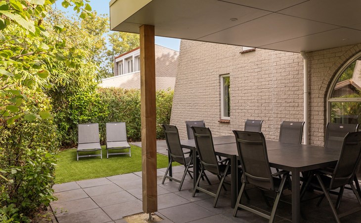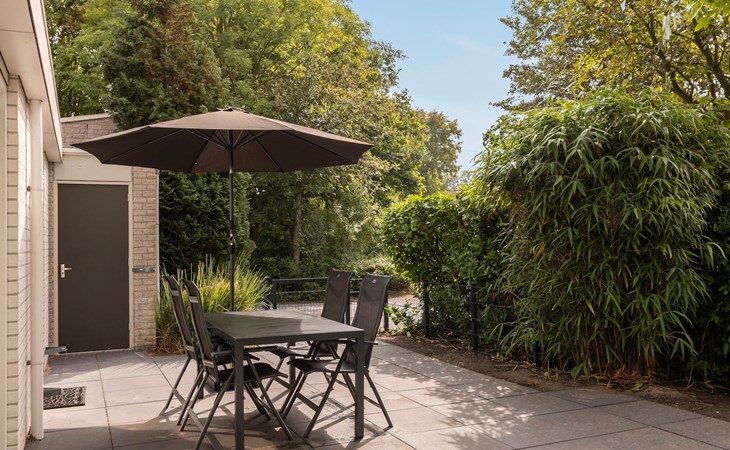 Buiten zijn 2 gemeubileerde terrassen waarvan 1 gedeeltelijk overdekt. In de zomer zijn er ligstoelen. Er is een verhard toegangspad naar en rondom de accommodatie en het terras is rolstoeltoegankelijk. Daarnaast heeft de bungalow vloerverwarming, een inpandige berging, wasmachine, traphekjes en zonnepanelen. De bedden zijn bij aankomst opgemaakt.