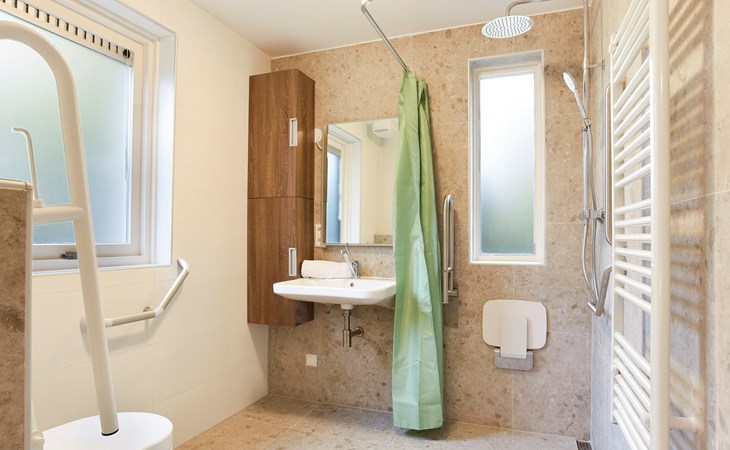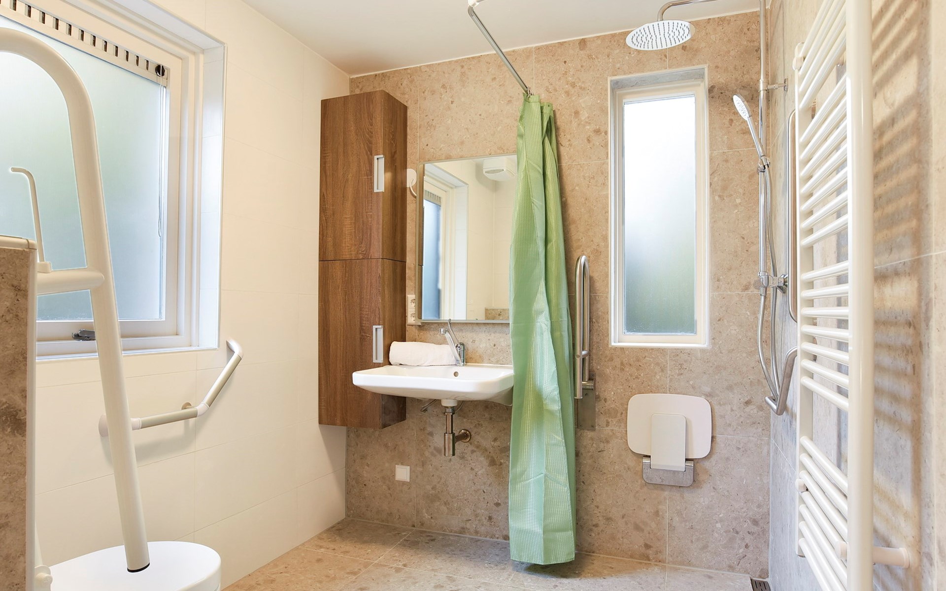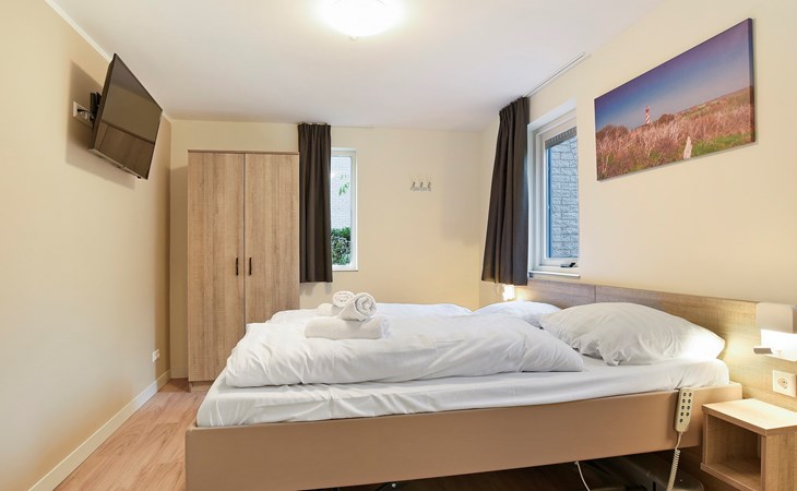 Op de begane grond bevinden zich 2 slaapkamers en 2 badkamers. Eén van de slaapkamers is aangepast met 2 hoog-/laagbedden met een papegaai. De andere slaapkamer heeft 1 éénpersoons boxspring en 1 verhoogd bed. De aangepaste badkamer heeft een vlakke douche met een douchestoel met armleuningen, wastafel en toilet met beugels. De andere badkamer beschikt over een sunshower en een sauna.