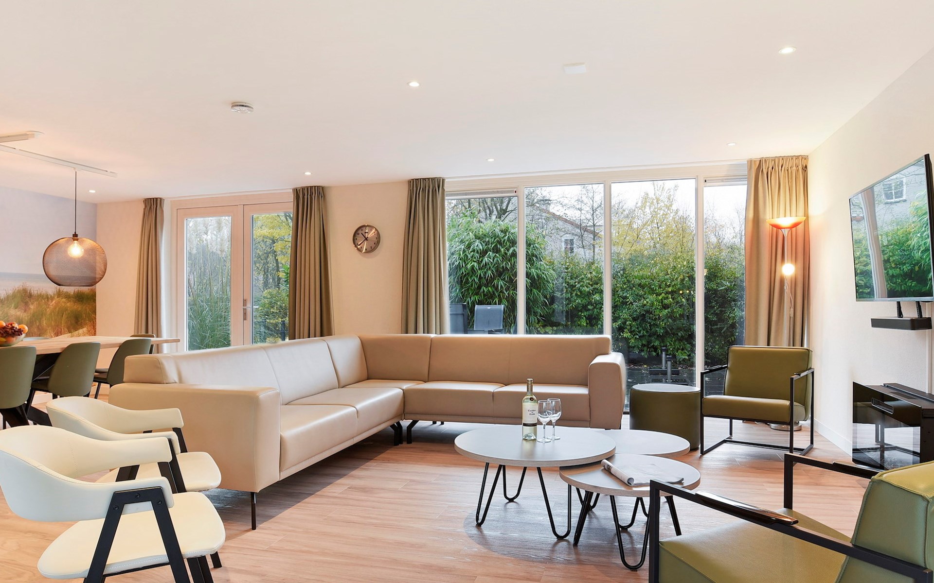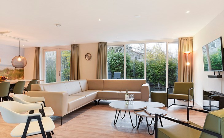 De woonkamer heeft een draaicirkel van 150 cm en is ingericht met een zithoek, elektrische sfeerhaard en een televisie met Chromecast. De bungalow heeft een open keuken met eethoek. De keuken is voorzien van onder andere een inductiekookplaat, koelkast met vriesvak, Nespresso, filterkoffiezetapparaat, combi oven en een vaatwasser. Het keukenwerkblad is in hoogte verstelbaar. De eettafel in de eethoek is minimaal 70 cm hoog en is onderrijdbaar.