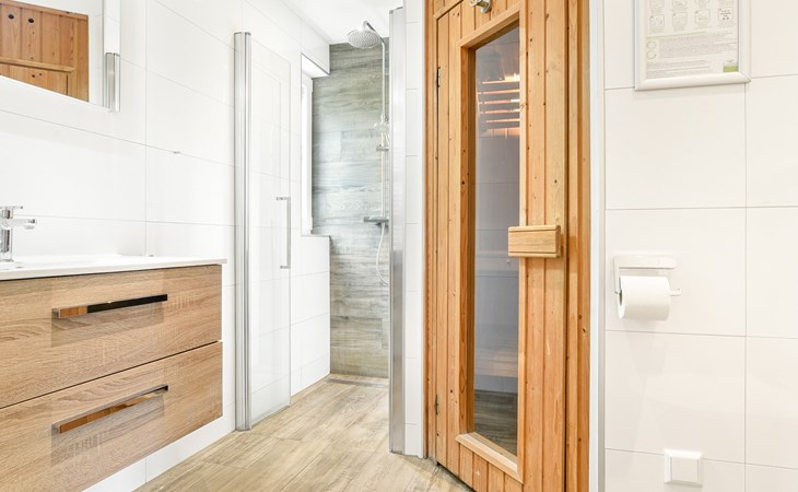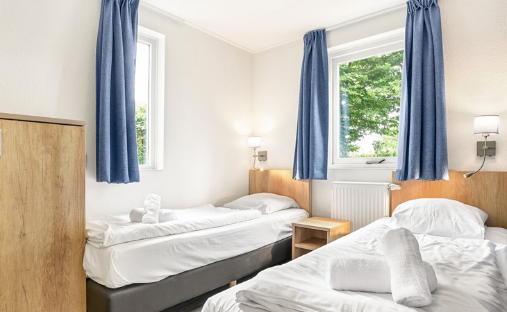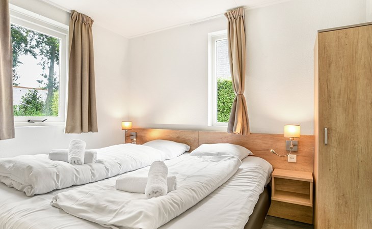 Op de begane grond bevinden zich 2 slaapkamers en 2 badkamers. De 2 slaapkamers hebben elk 2 éénpersoonsbedden, waarvan 1 slaapkamer ook een softtopper heeft. Eén van de badkamers beschikt over een vlakke douche met sunshower, wastafel en toilet. In deze badkamer is ook een privé sauna aanwezig. De andere badkamer beschikt over een ligbad, wastafel en toilet. De bungalow heeft een wasmachine.