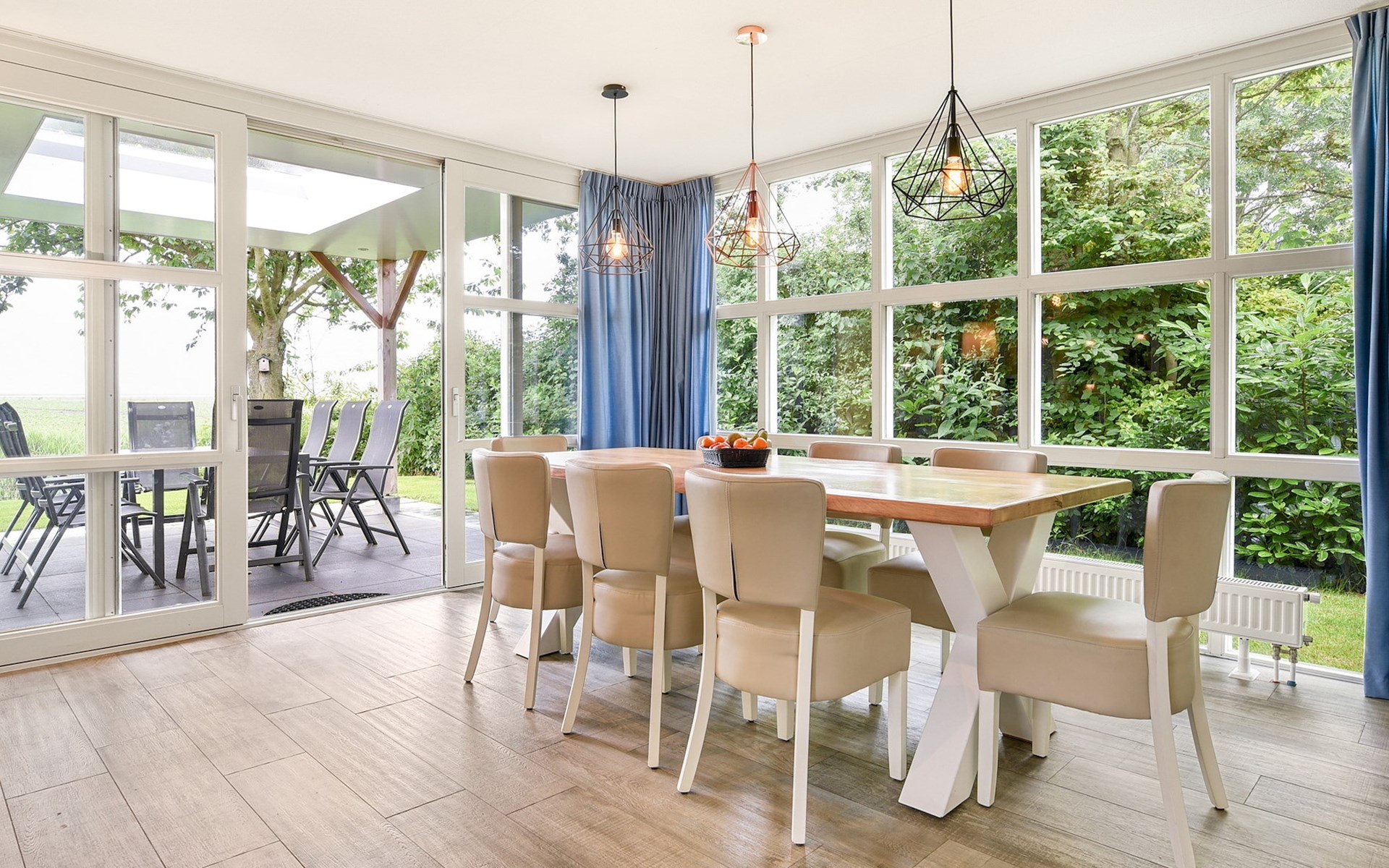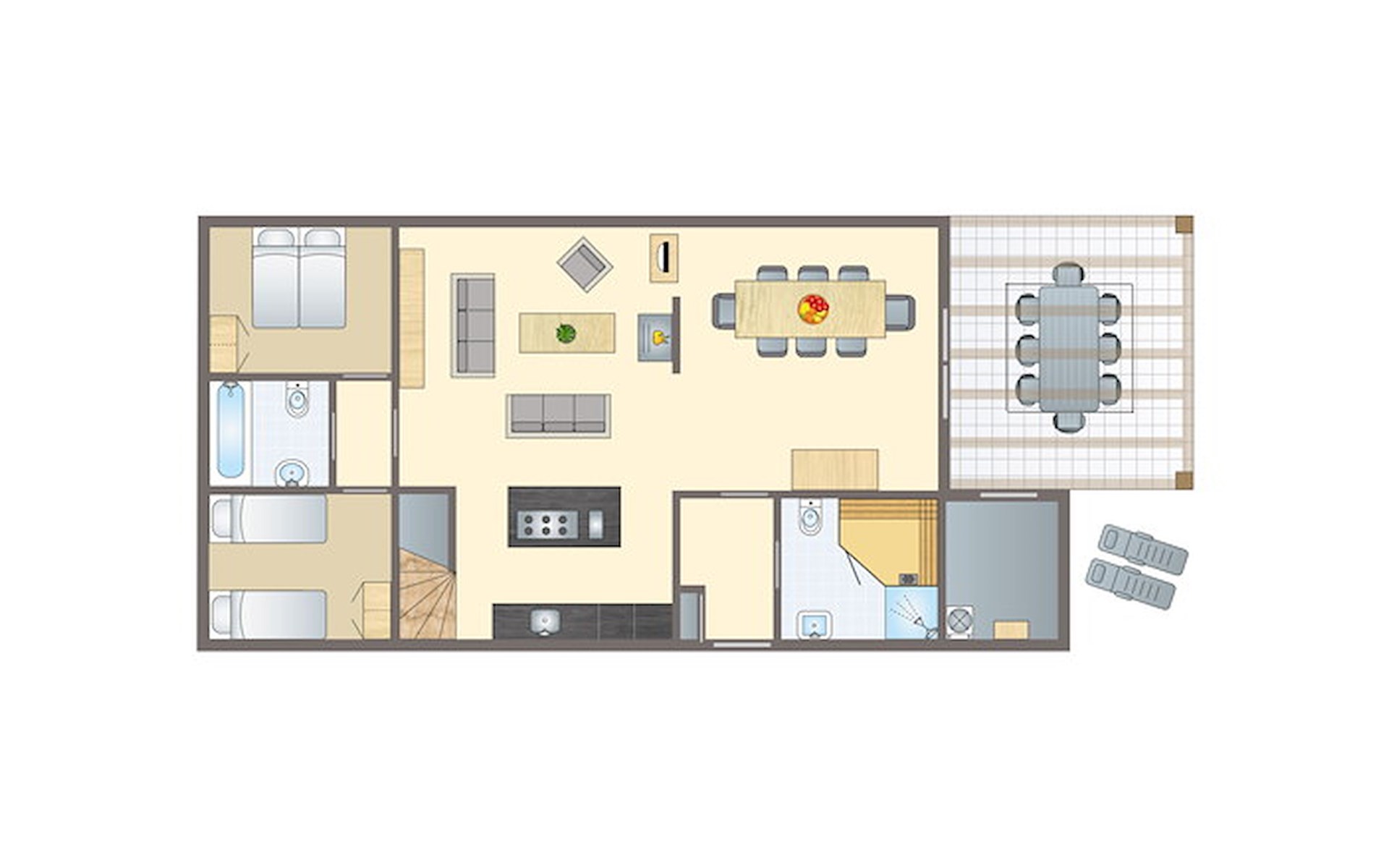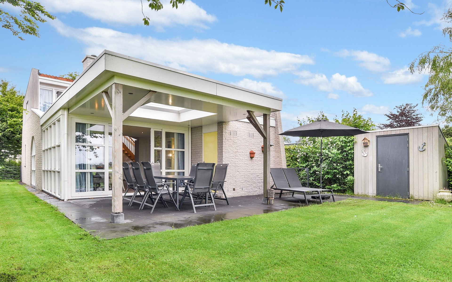 Buiten is een gemeubileerd terras met verstelbare ligstoelen en een parasol. De bungalow heeft een inpandige berging, traphekjes en kindveilige stopcontacten.