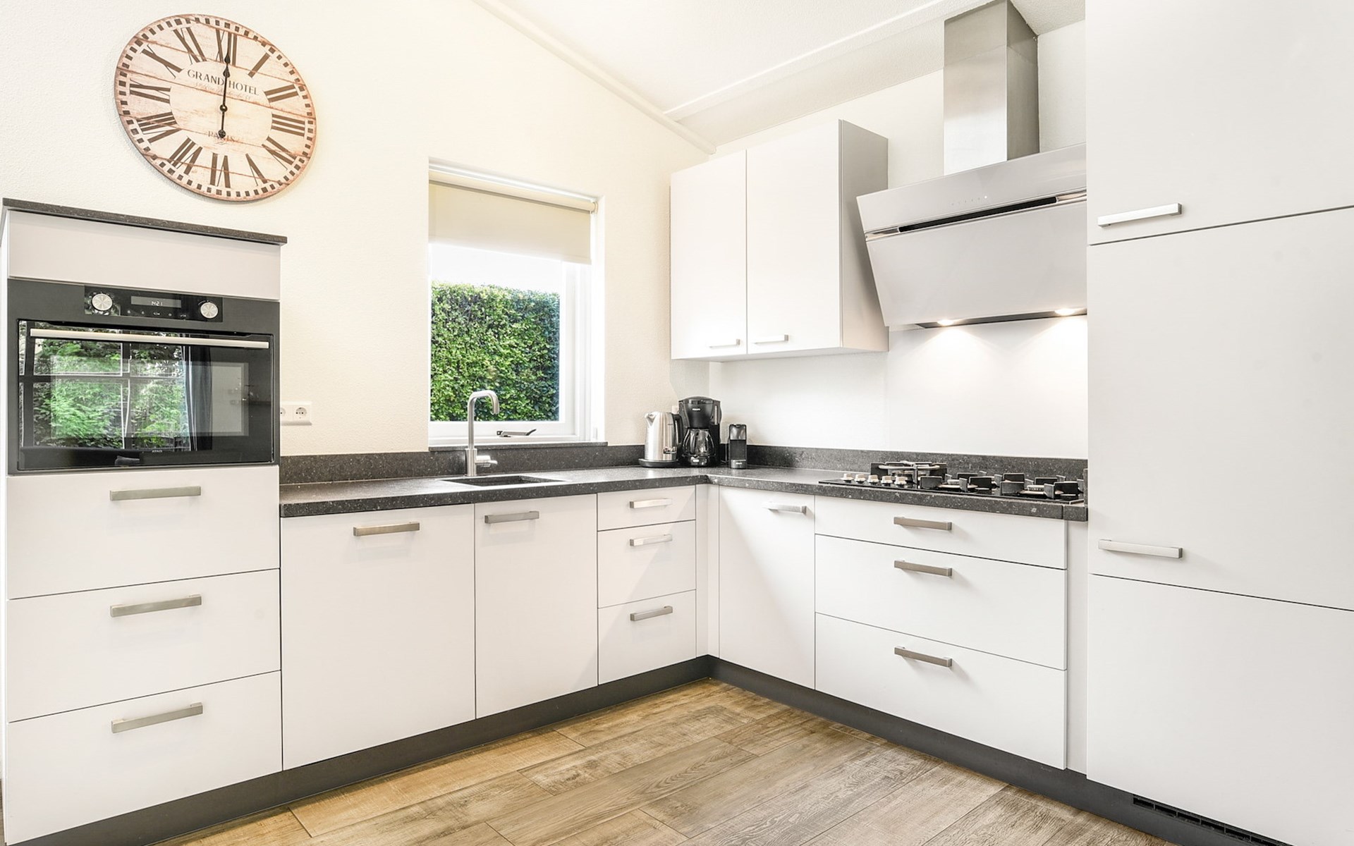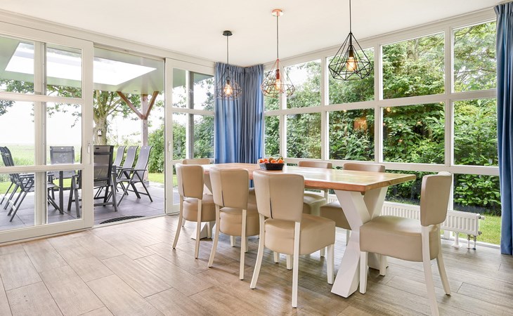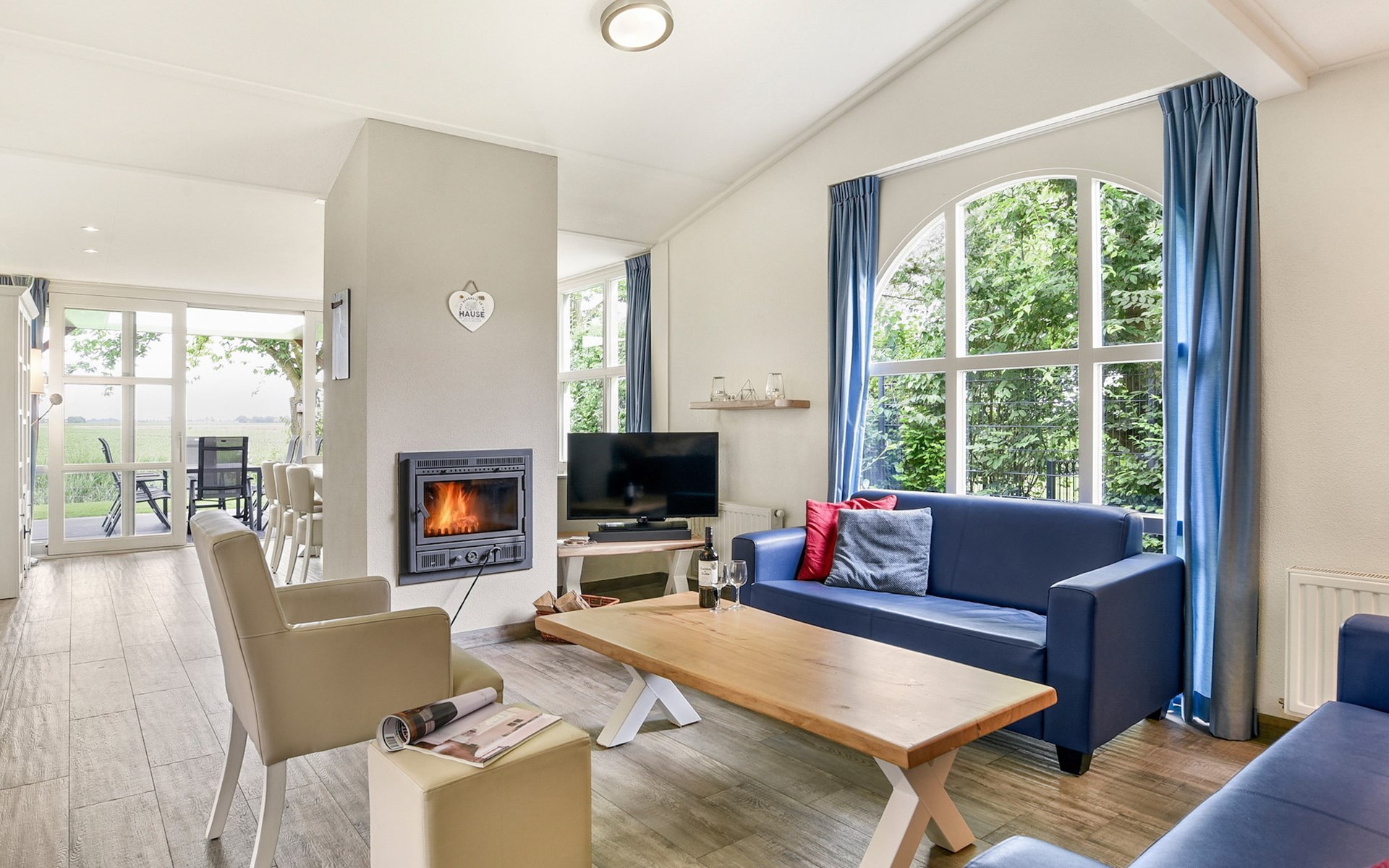 De woonkamer is ingericht met een zithoek, televisie met ingebouwde Chromecast, radio, bluetooth soundbar en spellendoos en grenst aan de open keuken met eethoek. De keuken is voorzien van onder andere een elektrische kookplaat, koelkast met vriesvak, Nespresso apparaat, filterkoffiezetapparaat, combimagnetron en een vaatwasser.