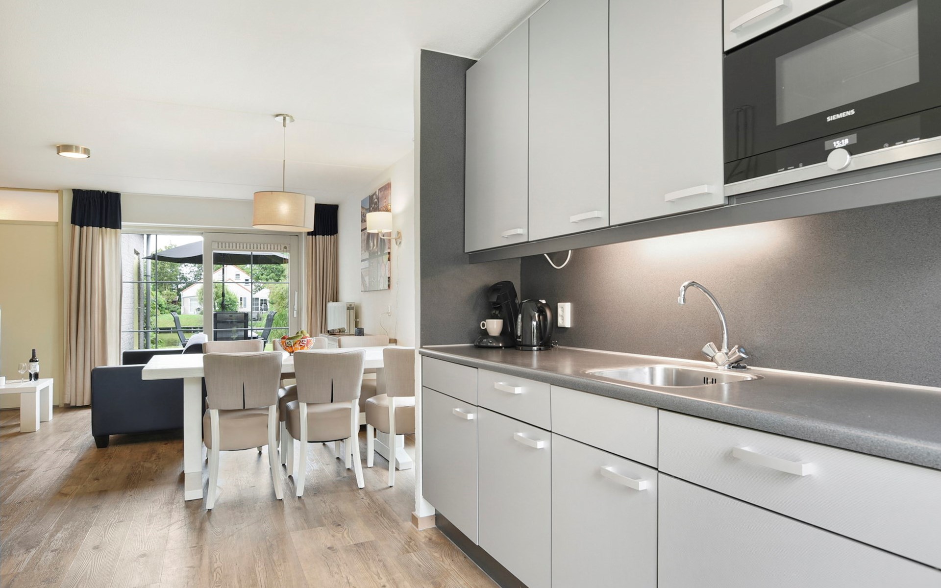 De woonkamer is ingericht met een zithoek, televisie met ingebouwde Chromecast, radio, bluetooth soundbar en een spellendoos. De bungalow heeft een open keuken met een eethoek. De keuken is voorzien van onder andere een koelkast met vriesvak, Senseo apparaat, filterkoffiezetapparaat, magnetron en een vaatwasser.