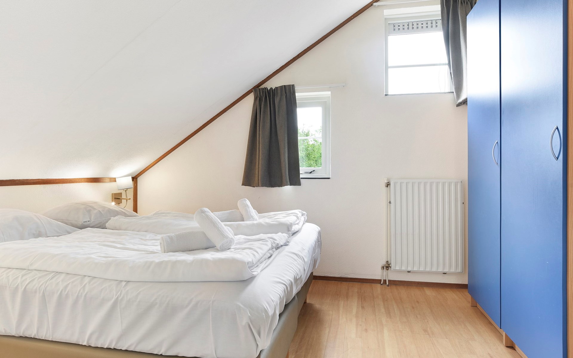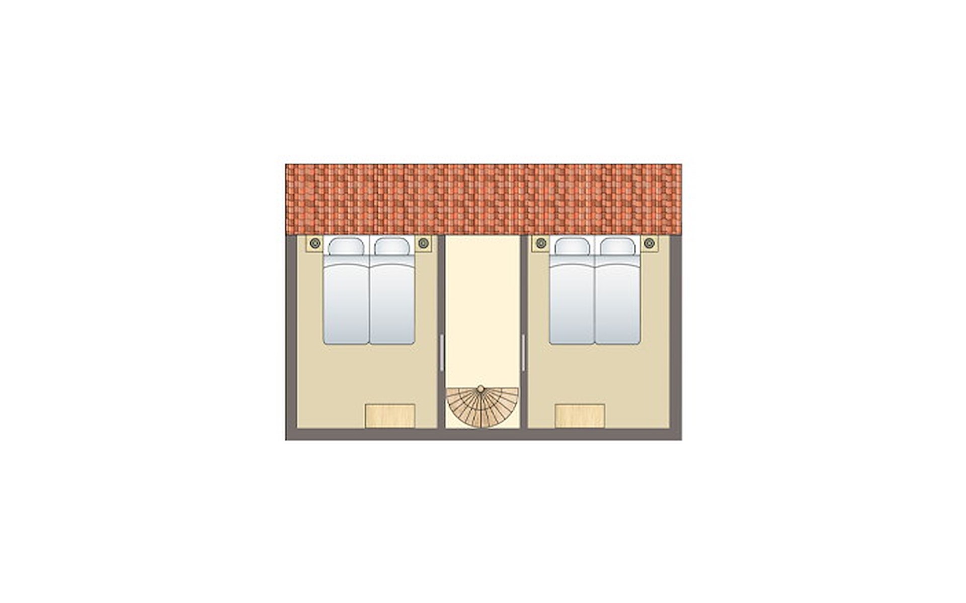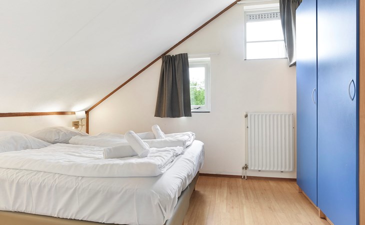 Op de eerste verdieping bevinden zich 2 slaapkamers. In één van de slaapkamers staan 2 éénpersoonsbedden met een softtopper. In de andere slaapkamer staan 2 éénpersoonsbedden.