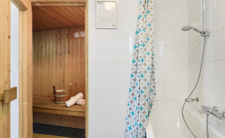 Op de begane grond bevindt zich 1 slaapkamer met 2 éénpersoonsbedden. De badkamer beschikt over een ligbad of douchecabine en een wastafel. Deze badkamer heeft tevens een privé sauna. Ook is er een apart toilet aanwezig op de begane grond. De bungalow heeft daarnaast een wasmachine.