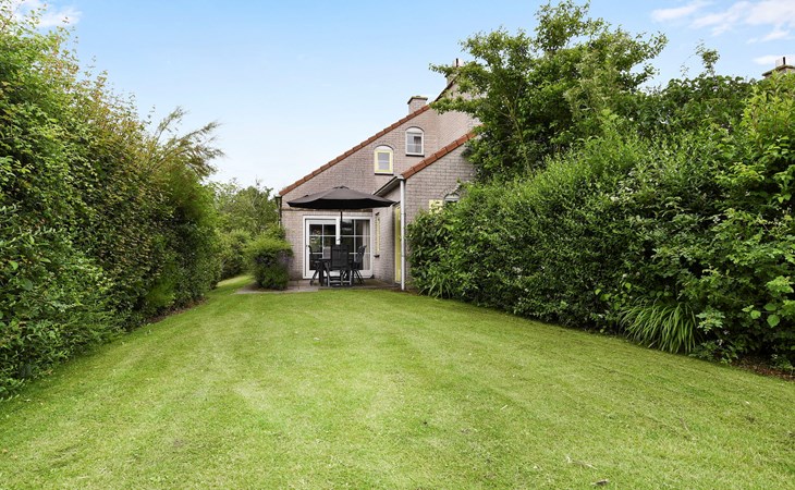 Buiten is een gemeubileerd terras met een parasol. De bungalow heeft traphekjes en kindveilige stopcontacten.