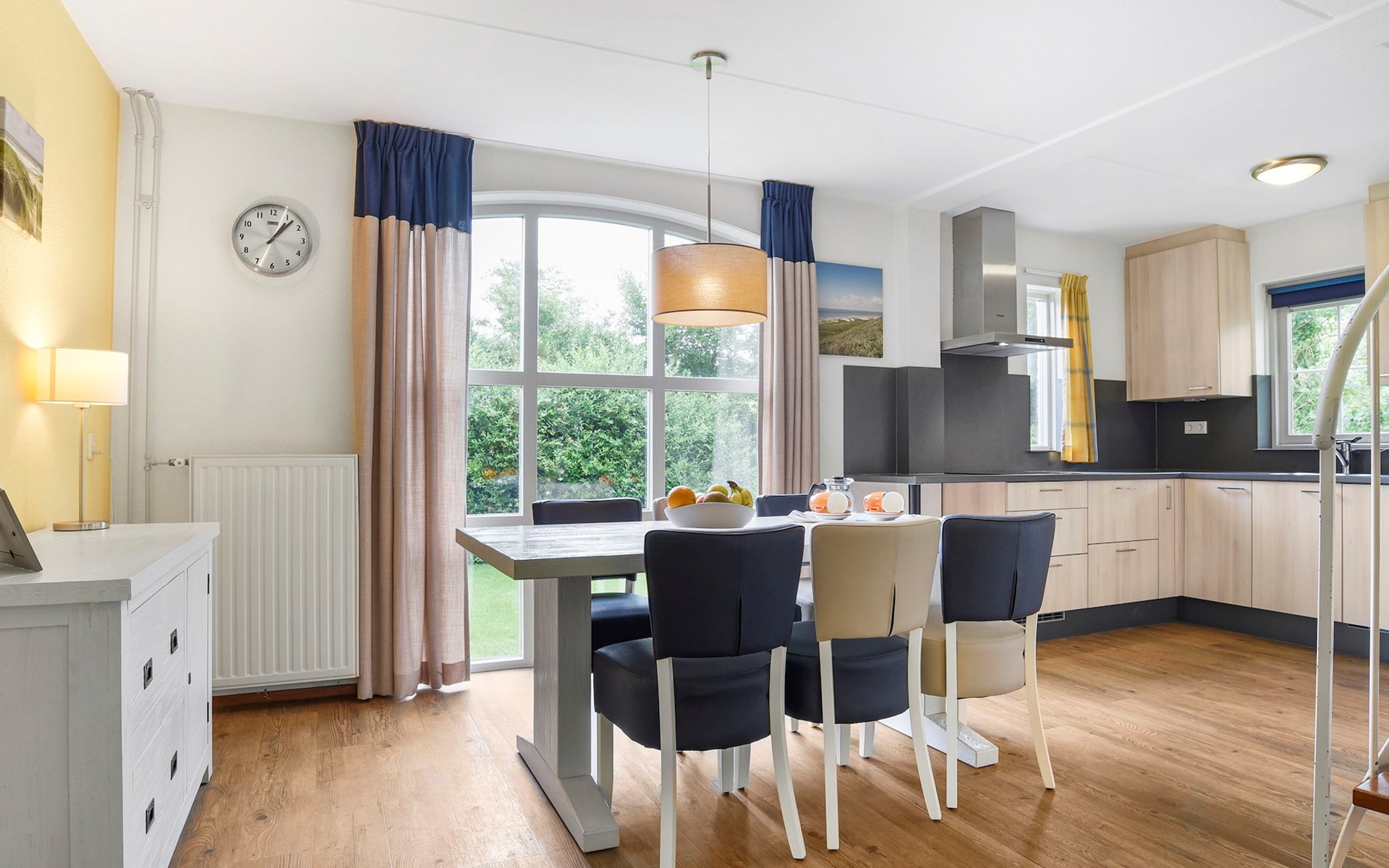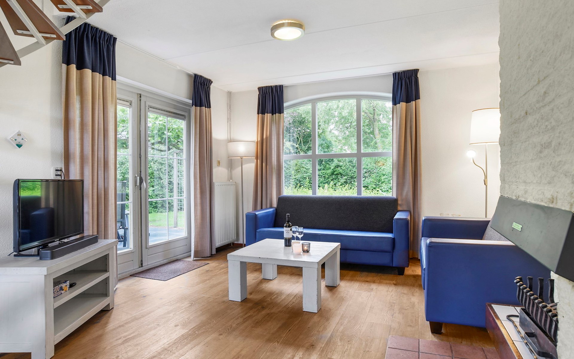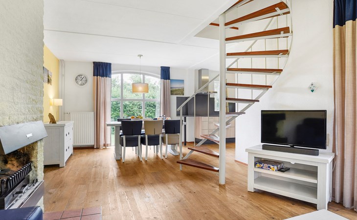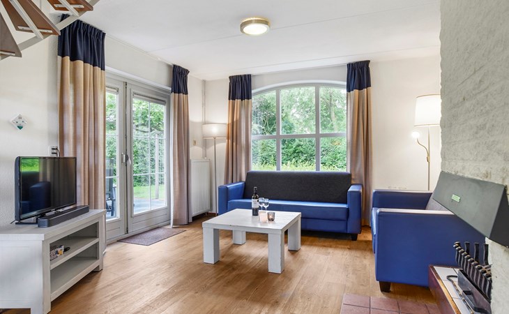 De woonkamer is ingericht met een zithoek, televisie met ingebouwde Chromecast, open haard, radio en een spellendoos. De bungalow heeft een open keuken met eethoek. De keuken is voorzien van onder andere een koelkast met vriesvak, Senseo apparaat, filterkoffiezetapparaat, magnetron en een vaatwasser.