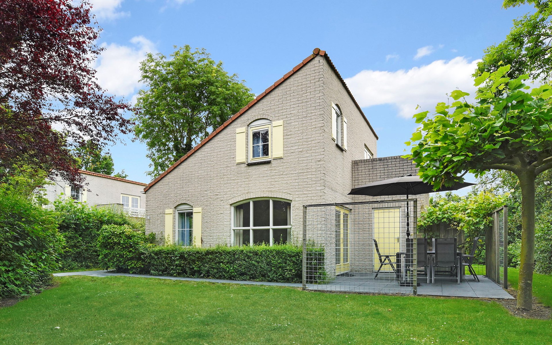 Buiten is een gemeubileerd terras met een parasol. De bungalow heeft traphekjes en kindveilige stopcontacten.