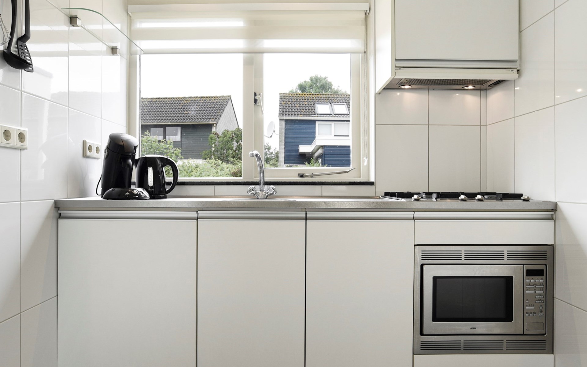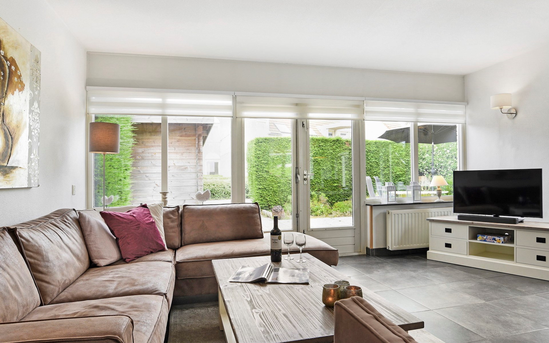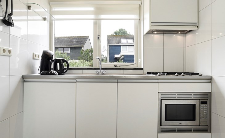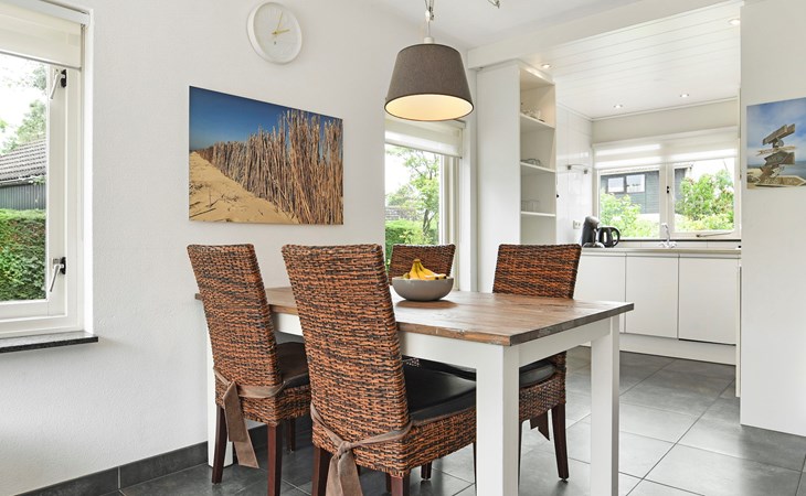 De woonkamer is ingericht met een zithoek, televisie met ingebouwde Chromecast, radio, bluetooth soundbar en een spellendoos. Aangrenzend is de open keuken met eethoek. De keuken is voorzien van onder andere een koelkast met vriesvak, Senseo apparaat, filterkoffiezetapparaat, magnetron en een vaatwasser.