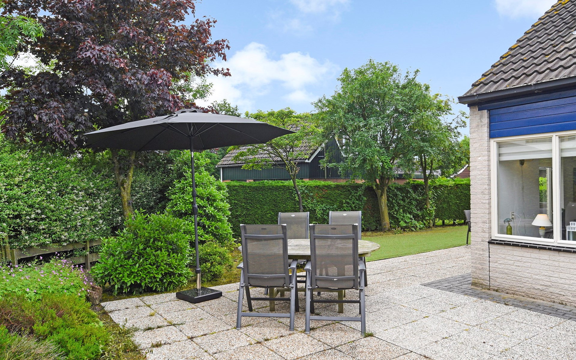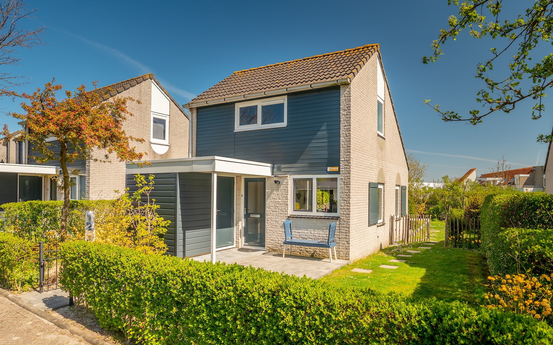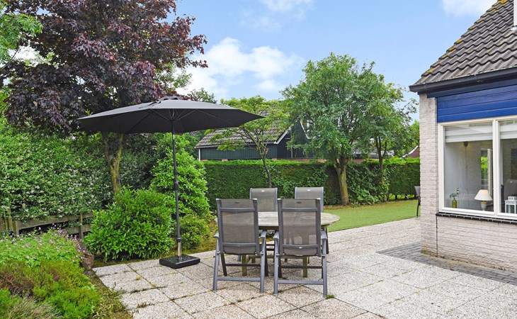 Rondom de bungalow is een tuin met een gemeubileerd terras met een parasol. De bungalow heeft traphekjes en kindveilige stopcontacten.