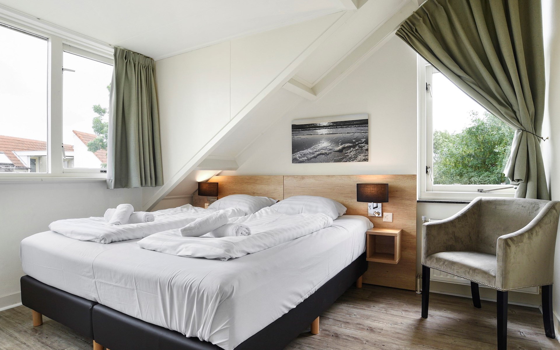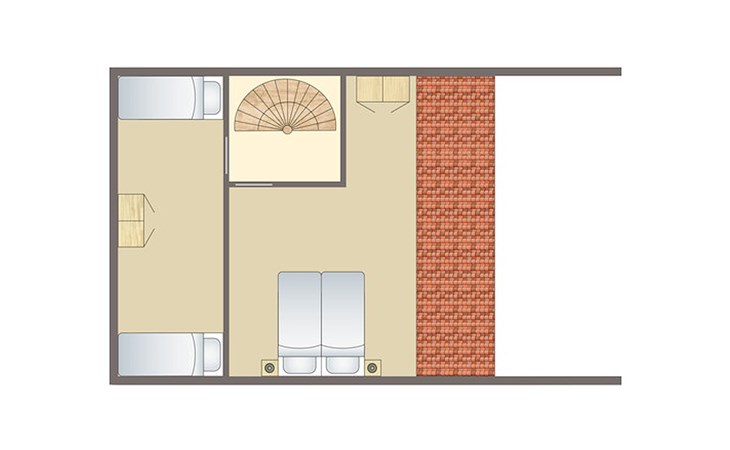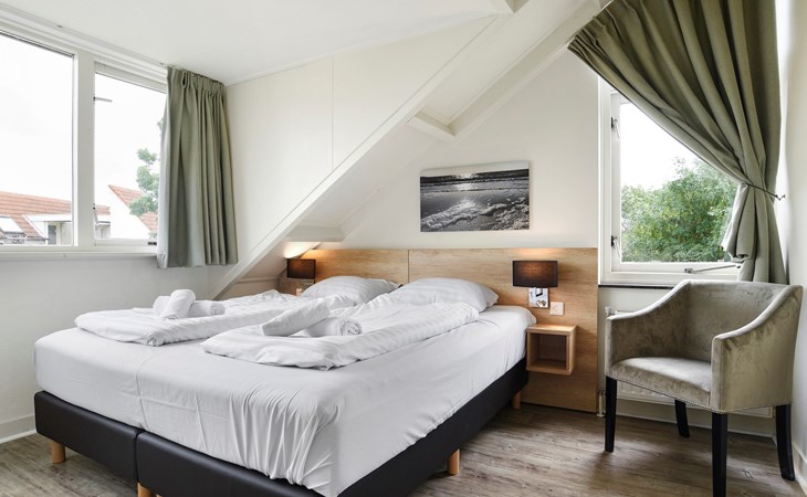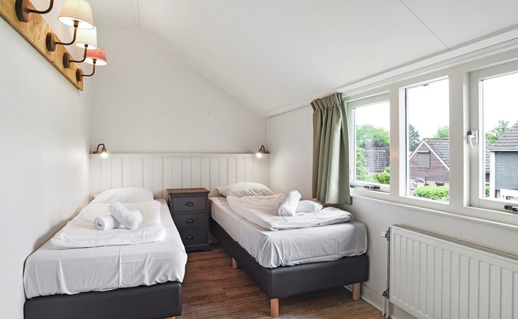 Op de eerste verdieping bevinden zich 2 slaapkamers. In één van de slaapkamers staan 2 éénpersoonsbedden met een softtopper. De andere slaapkamer heeft 2 éénpersoonsbedden.