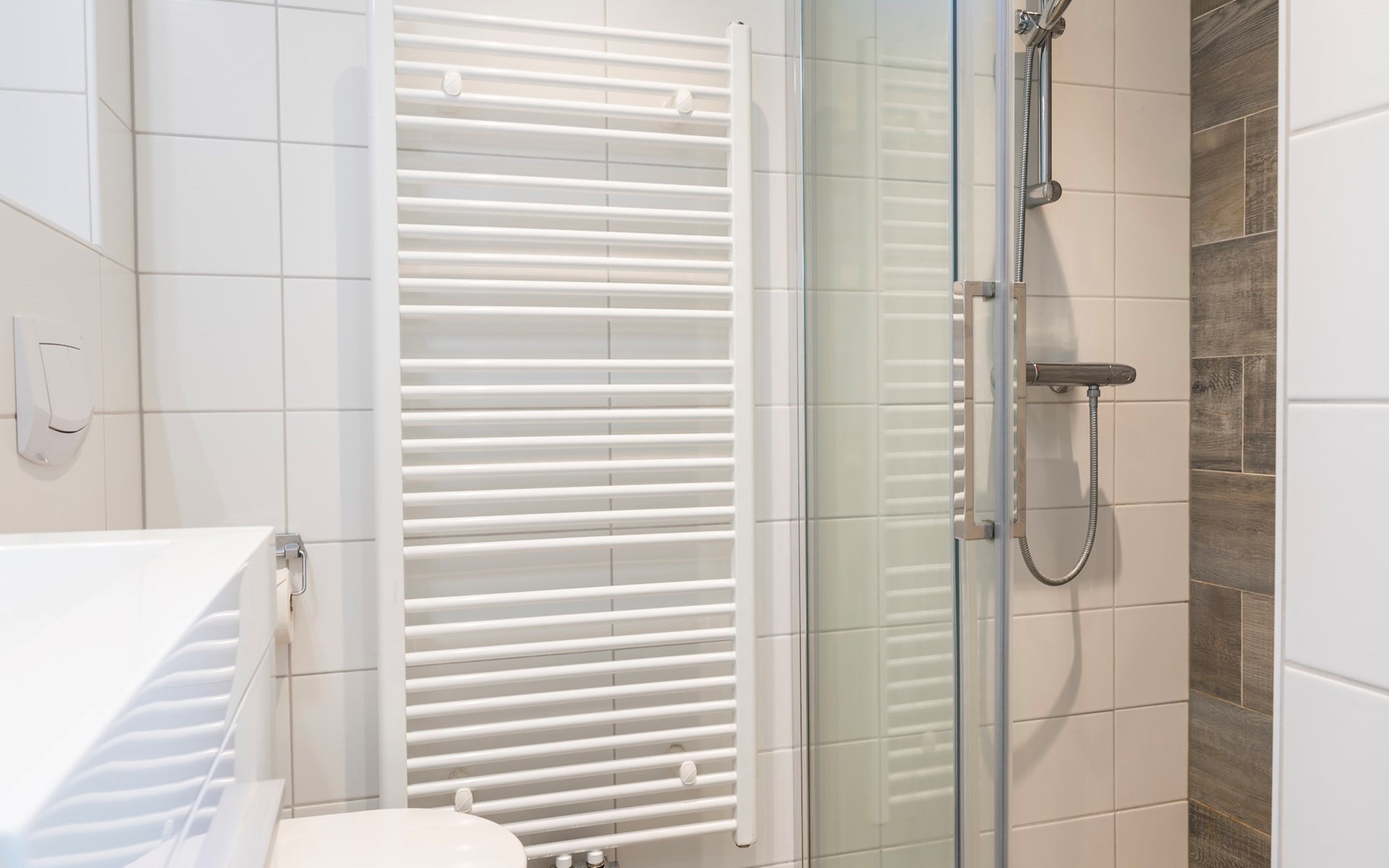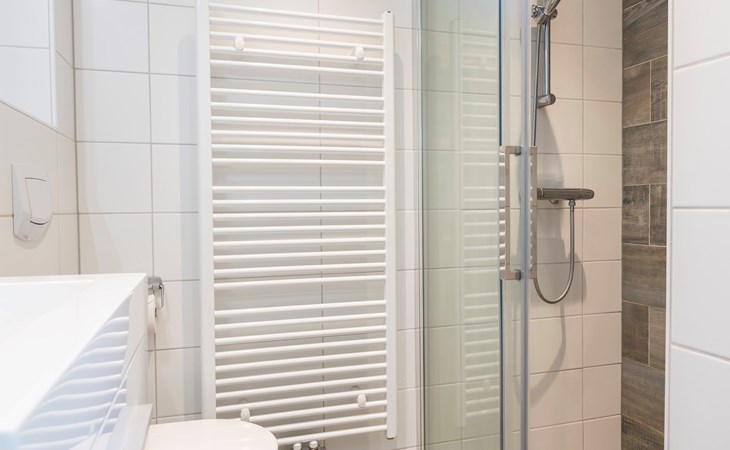 De badkamer bevindt zich op de begane grond en beschikt over een douchecabine, wastafel en een toilet. Er is een wasmachine aanwezig.