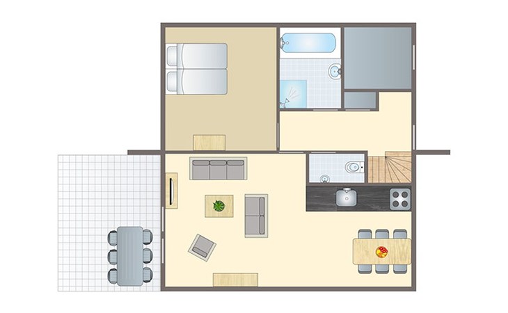 Buiten is een terras met deels verstelbaar tuinmeubilair en een parasol. De bungalow heeft een inpandige berging en een traphekje.