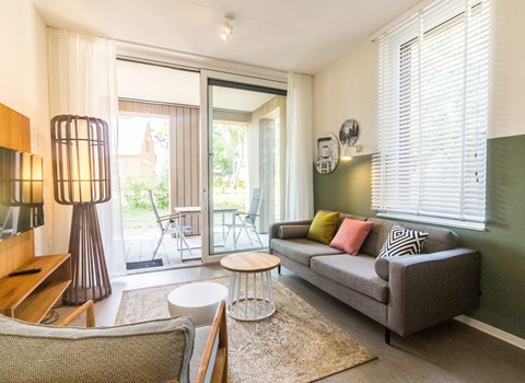 Het naastgelegen luxe chalet biedt ruimte voor 2 personen. Er is een comfortabele zithoek met een slaapbank en een aangrenzend eetgedeelte voor 4 personen. De luxe keuken is voorzien van alle comfort, waaronder een keramische kookplaat, een koelkast, een combimagnetron en een wasmachine. De moderne badkamer is uitgerust met een douche, een wastafel en een toilet.