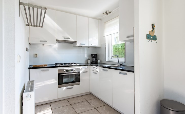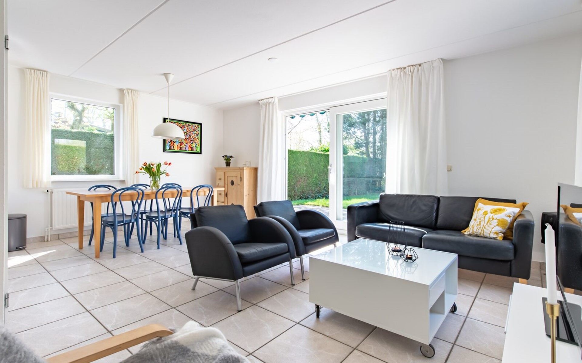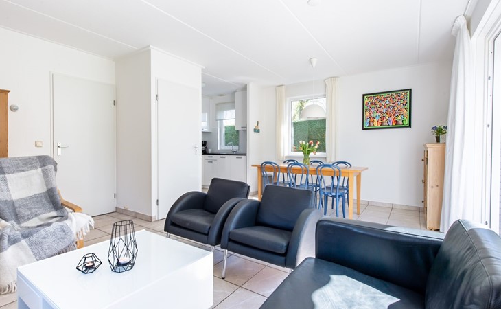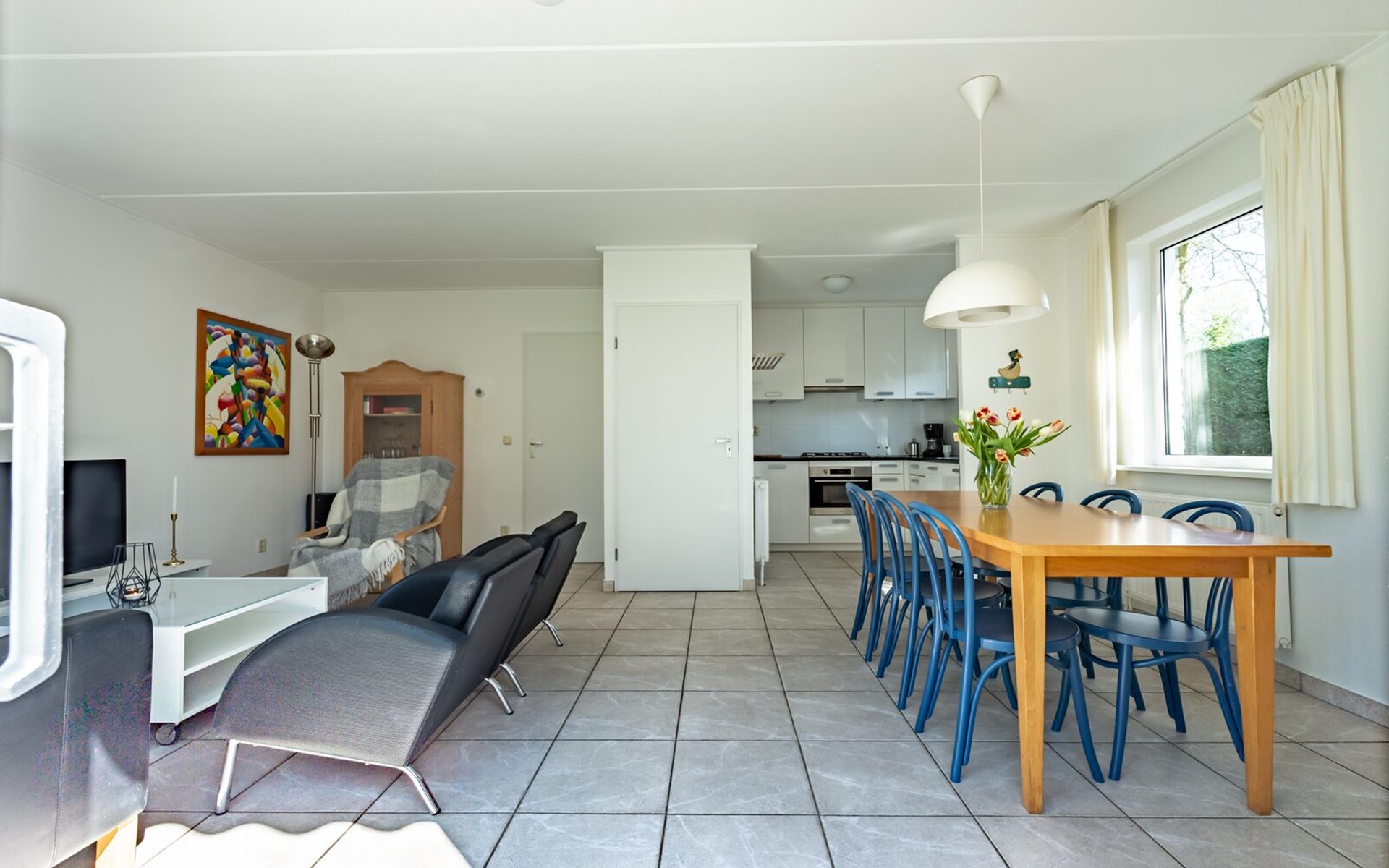 De woonkamer met open keuken is heerlijk licht en gericht op het zuiden. Een schuifpui met markies geeft toegang tot de dichtbegroeide beschutte tuin en het terras met comfortabele tuinmeubelen en twee ligbedden. In de woonkamer vindt u een comfortabele zithoek met een flatscreen TV. De luxe open keuken is volledig uitgerust met moderne kwaliteitsapparatuur. U vindt hier onder anderen een combi magnetron en een vaatwasser.