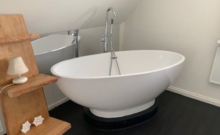 Boven bevinden zich de andere twee slaapkamers, waarbij op de master bedroom je nog een heerlijk ruim ligbad aantreft. Gezellig met z'n tweeën romantisch in bad, de tijd vergeten. Beide slaapkamers beschikken over hun eigen was tafel combinatie, zodat je ook als je met meerderen bent, je toch je eigen privacy hebt.